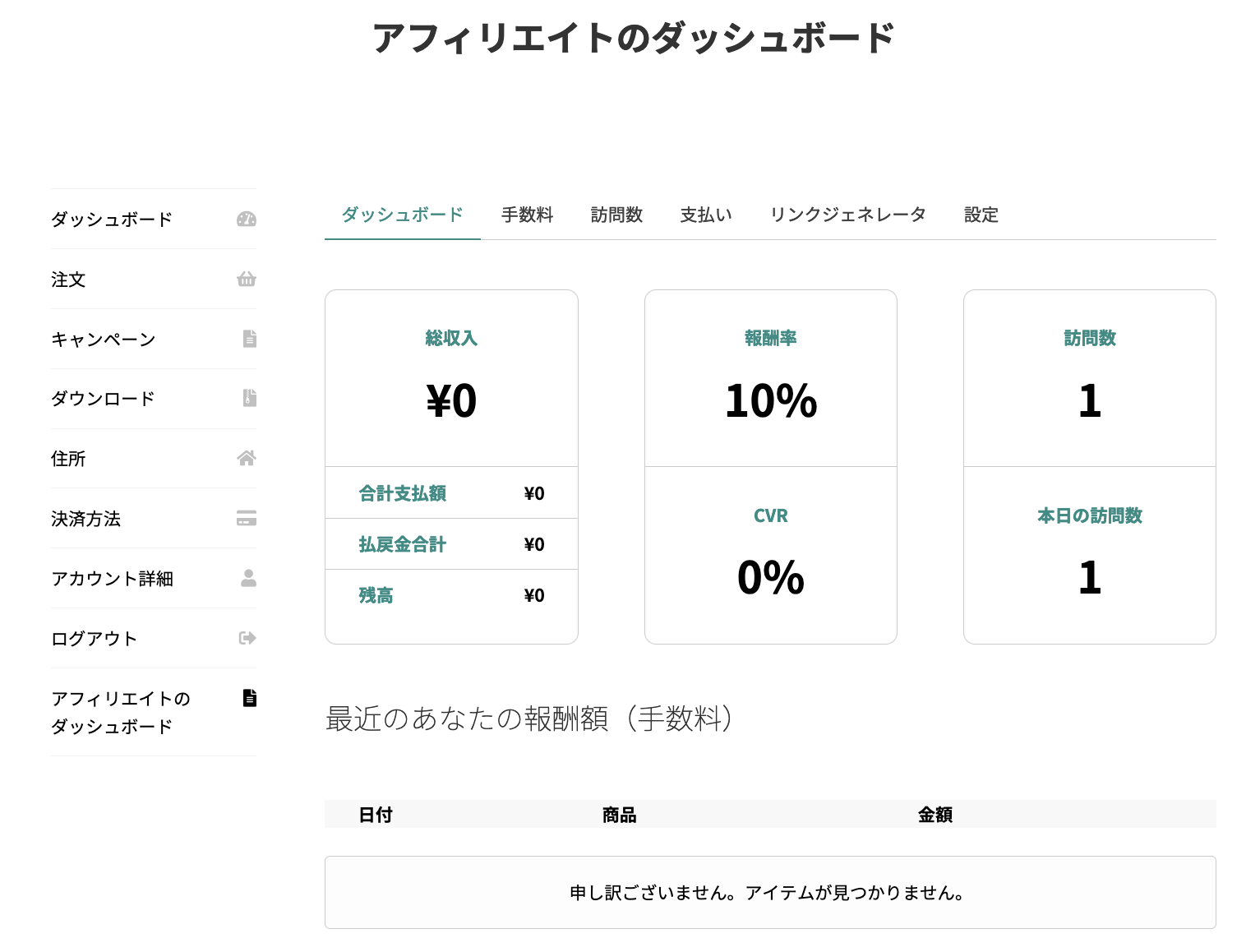 アフィリエイトとして登録されたユーザーは専用のダッシュボードが提供されます。